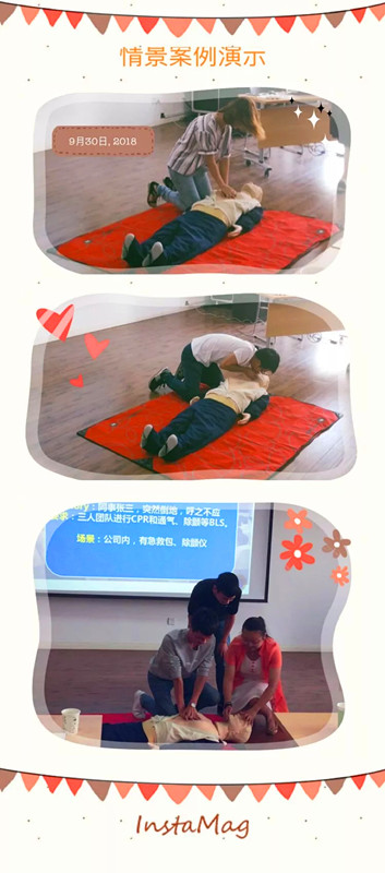 魏教授采用理論知識講授與實際操作相結合的形式講解如何處理各種突發(fā)意外傷害,如何在事發(fā)現場挽救生命和降低傷害程度,運用許多情景案例演示CAB心肺復蘇、CPR電除顫、“海姆立克”救治等基本救護方法和技巧,還講解了日常生活中出現燒灼傷、動物抓傷、觸電和中毒的處置方法。參與培訓人員認真聆聽領會,積極主動上場體驗,現場互動問答生動有趣,氣氛活躍。