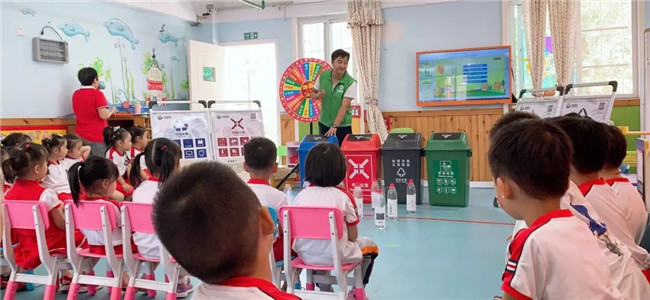 通俗易懂的講解后,孩子們對垃圾分類有了一個(gè)初步的認(rèn)識(shí)。接下來開展孩子們喜歡的游戲互動(dòng)環(huán)節(jié),通過“垃圾分類問答轉(zhuǎn)盤”、“分類套圈圈”的小游戲,孩子們在歡聲笑語中學(xué)習(xí)到了豐富的垃圾分類知識(shí)。