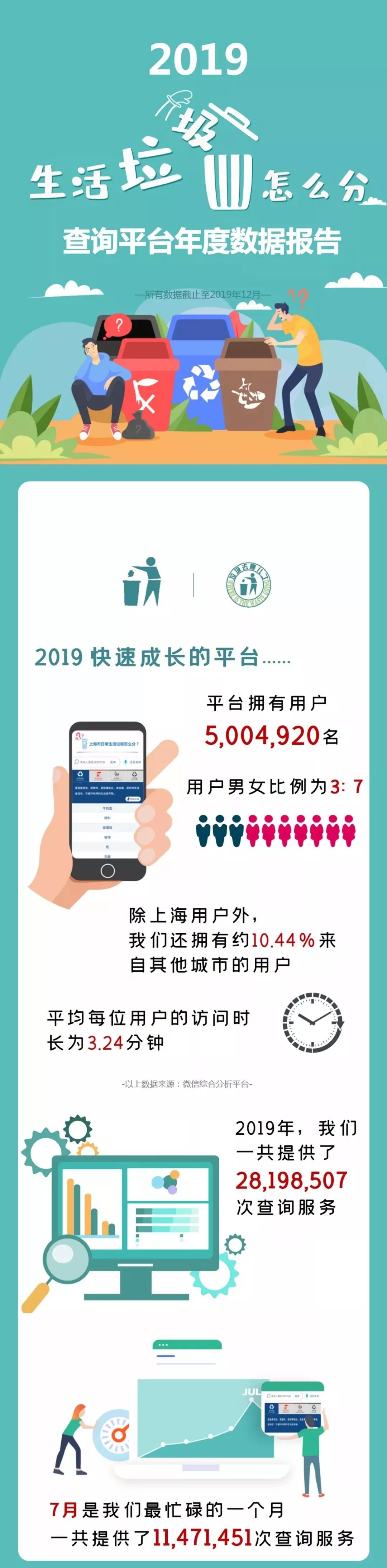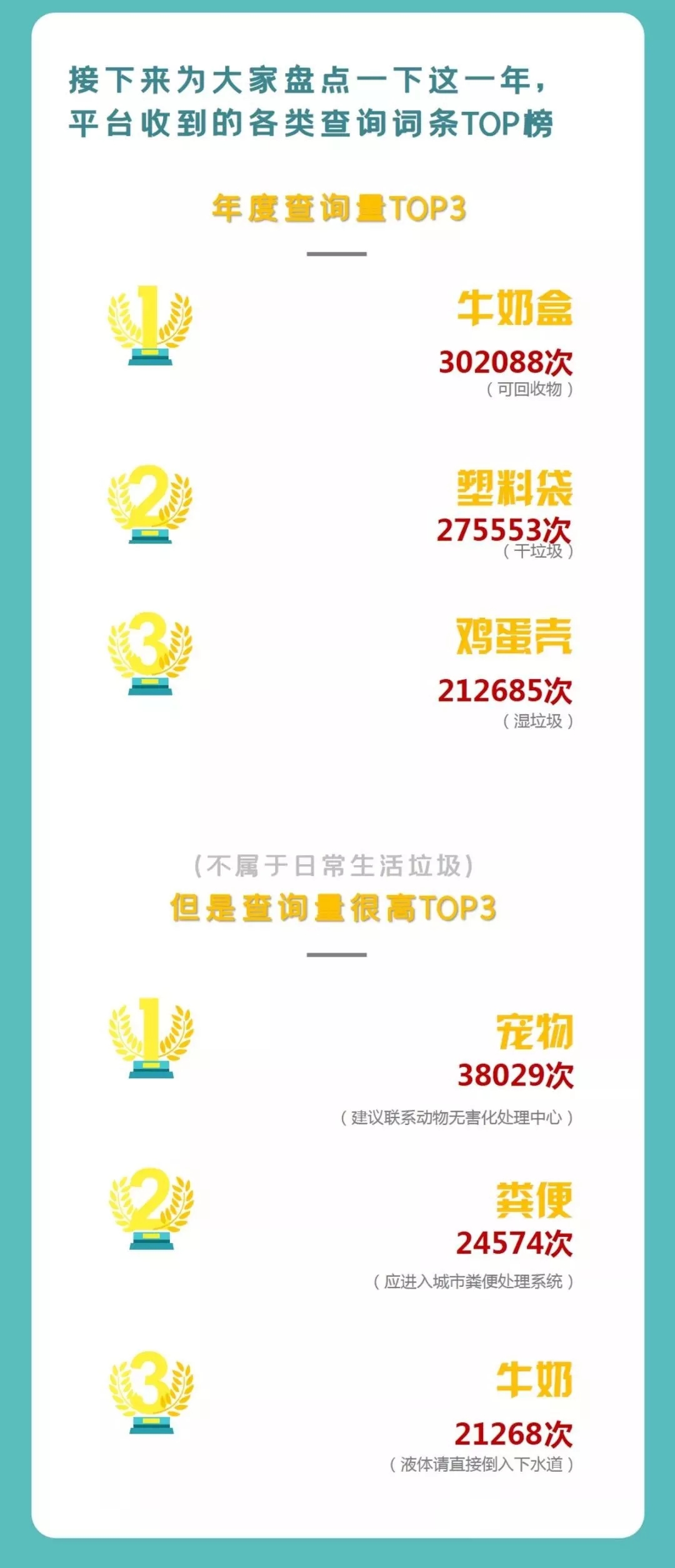 市綠化市容局說,自2019年7月1日《上海市生活垃圾管理條例》實施以來,使用“上海發(fā)布”市政大廳“垃圾分類查詢”功能和“垃圾分類查詢小程序”的用戶已超500萬名,平均每位用戶訪問時長為3.24分鐘。在各類查詢詞條中,年度查詢量前三的生活垃圾分別為牛奶盒、塑料袋和雞蛋殼。詳見↓