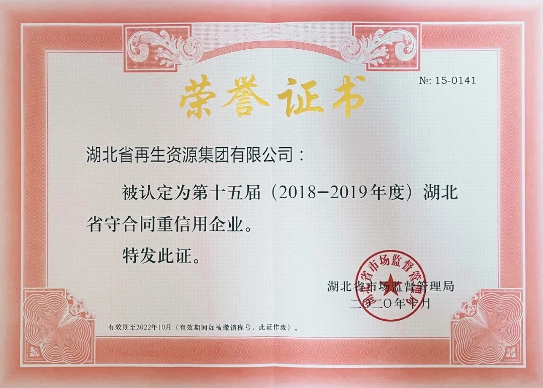本次獲評“守合同重信用”企業(yè),是對湖北省再生資源集團一直以來履職盡責、守約重信的高度肯定,也是對湖北省再生資源集團繼續(xù)做好本業(yè)、擔當國企責任的有力激勵。