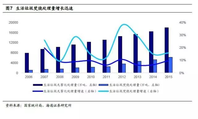 目前衛(wèi)生填埋處理占主導(dǎo)地位,長期看焚燒處理優(yōu)勢明顯、增速較快。常見的垃圾無害化處理方式有衛(wèi)生填埋、焚燒和高溫堆肥。其中,我國垃圾焚燒處理量占比從2006年的14.45%上升到2015年的34.28%,2015年焚燒處理量為6176萬噸,處理能力為21.9萬噸/日(約8000萬噸/年);衛(wèi)生填埋占比從2006年的81.4%下降到2015年的63.75%,2015年處理量為11483萬噸,處理能力為34.4萬噸/日(約12600萬噸/年),而近年高溫堆肥處理量極少,2015年僅為354萬噸。垃圾焚燒與填埋法相比,經(jīng)濟效益和環(huán)境保護程度更高:①減量縮容:在垃圾經(jīng)過焚燒后,一般可減重80%,減容90%以上,節(jié)約大量的土地資源;②資源再利用:按熱值比較,每噸生活垃圾約相當(dāng)于0.2-0.25噸標(biāo)準煤,垃圾焚燒發(fā)電的資源綜合利用效益相當(dāng)可觀;③污染弱:垃圾焚燒主要產(chǎn)生的氣體為二氧化碳。因而垃圾焚燒成為近年來國家推崇的無害化處理方式,在垃圾無害化處理中的占比逐年上升。