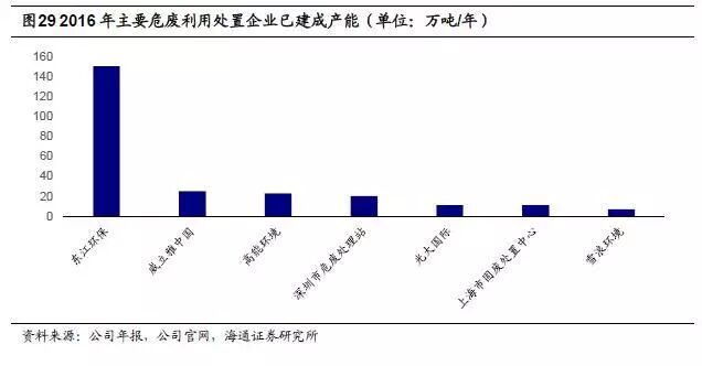 東江環(huán)保龍頭地位顯著。截止2016年底,東江環(huán)保已擁有國家危險廢物名錄中46大類中的44類危廢經(jīng)營資質(zhì),僅次于威立雅中國,公司危廢利用和處置資質(zhì)近150萬噸/年(其中無害化處置資質(zhì)達到72萬噸/年),遠遠高于威立雅中國,另根據(jù)公司規(guī)劃,預(yù)計到2020年總產(chǎn)能將達到350萬噸(其中無害化產(chǎn)能達到200萬噸),增長空間可觀。