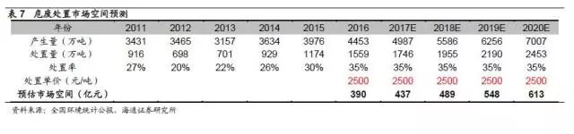危廢處置價格穩(wěn)步上升,市場空間巨大。從核準經(jīng)營規(guī)??矗U處置產(chǎn)能緊缺,2015年核準處置規(guī)模僅982.4萬噸/年。近年來,危廢處置價格呈現(xiàn)穩(wěn)步上升趨勢。以行業(yè)內(nèi)某領(lǐng)先企業(yè)為例,2013年,其危廢處置業(yè)務(wù)平均價格為1500元/噸左右,2016年則上升至2500元/噸左右。以全國環(huán)境統(tǒng)計公報數(shù)據(jù)為基礎(chǔ),假設(shè)未來幾年危廢產(chǎn)生量保持過去十年復(fù)合增長率12%的增速,保守估計處置率為35%,單位處置成本為2500元/噸,則預(yù)計2020年危廢處置市場為613億元,2017-2020處置市場空間總計2086億元??紤]到還有大量的危廢沒有進入國家統(tǒng)計口徑,若將這些量考慮在內(nèi),市場空間還將提升2-3倍。