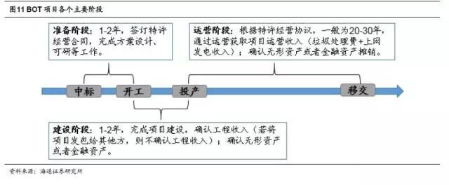 對項目公司而言,項目中標(biāo)后,主要會經(jīng)歷三個階段,分別是準備階段(一般為1-2年,完成項目的前期準備工作,簽訂特許經(jīng)營合同,完成環(huán)評、可研報告等工作)、建設(shè)階段(一般為1-2年,完成項目建設(shè),確認工程收入,若項目外包給其他方,則不確認)和運營階段(在特許經(jīng)營期內(nèi),負責(zé)項目的運營,獲取垃圾處理費補貼和上網(wǎng)發(fā)電收入),特許經(jīng)營期到期之后,項目無償移交給政府。