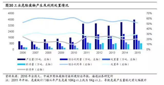 危險廢物產(chǎn)生量大,綜合利用處置率有待提高。根據(jù)環(huán)境統(tǒng)計年報數(shù)據(jù),2015年全國工業(yè)危險廢物產(chǎn)生量為3976萬噸,占一般工業(yè)固體廢物產(chǎn)生量的1.22%,過去十年年均復(fù)合增長率約為12%;綜合利用量為2050萬噸,綜合利用率52%;處置量1174萬噸,處置率30%;貯存量810.3萬噸(含前期);危廢綜合利用處置率約為82%。