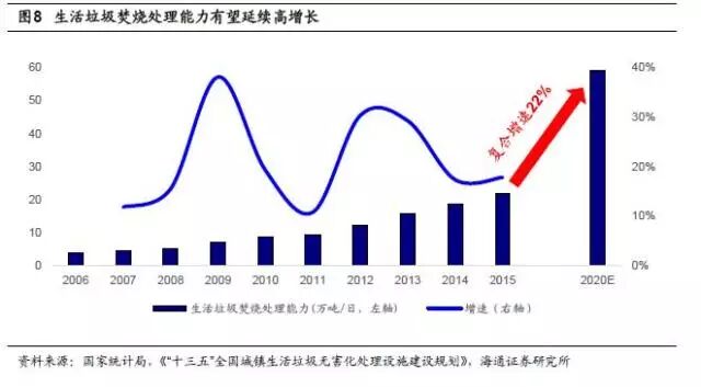 生活垃圾焚燒處理量增速高于無害化處理整體水平,“十三五”期間有望延續(xù)高增長。我國生活垃圾焚燒處理量增長迅速,從2006年的1138萬噸增長至2015年的6176萬噸,十年間復(fù)合增速高達20.68%,遠高于生活垃圾無害化處理領(lǐng)域整體9.63%的復(fù)合增速。行業(yè)在經(jīng)歷了2012、2013年的高速增長后,2014、2015年增速略有下滑,2015年生活垃圾焚燒處理量增速為15.87%,處理能力增速為17.8%,整個“十二五”期間焚燒處理量復(fù)合增速24.15%,根據(jù)《“十三五”全國城鎮(zhèn)生活垃圾無害化處理設(shè)施建設(shè)規(guī)劃》,到2020年生活垃圾焚燒處理能力將達到59.14萬噸/日,十三五期間生活垃圾焚燒處理能力復(fù)合增速將達到22%,行業(yè)高增長有望延續(xù)。