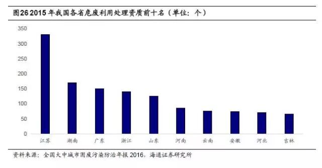 我國危廢綜合利用與處置行業(yè)格局分散,市場集中度較低。2015年全國危廢許可證(含醫(yī)療危廢)數(shù)量為2034個,較前一年增加113個,其中江蘇省頒發(fā)的危廢許可證數(shù)量為327個,數(shù)量上排名第一,湖南、廣東分列二、三位,數(shù)量在150個左右,浙江、山東也超過100個。截止到2015年,全國危險廢物經(jīng)營單位核準經(jīng)營規(guī)模達到5263萬噸/年,其中核準利用規(guī)模為4155.1萬噸/年,核準處置規(guī)模為982.4萬噸/年,平均每個許可證僅對應(yīng)2.59萬噸/年的利用和處置能力。根據(jù)2008年環(huán)保部公布的危廢處置名單,當(dāng)時全國1500多家具有危廢處理資質(zhì)的企業(yè)中,處理能力達到1000噸/日的企業(yè)僅占0.3%,目前行業(yè)格局沒有太大變化。