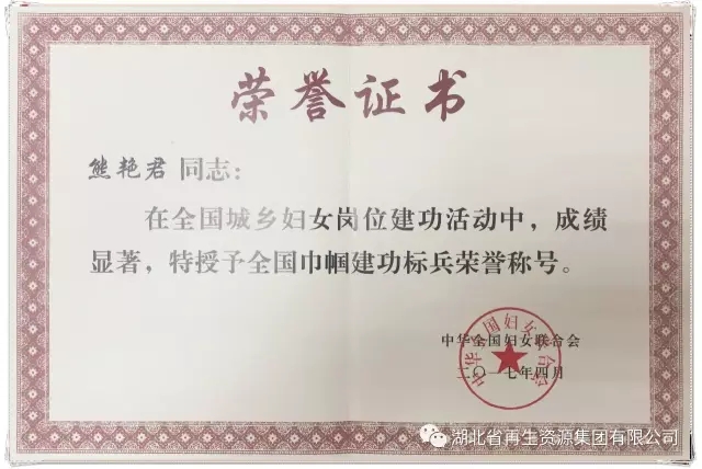 近期,中華全國婦女聯(lián)合會(huì)作出“關(guān)于表彰全國巾幗文明崗、全國巾幗建功標(biāo)兵、全國巾幗建功先進(jìn)集體的決定”(婦字〔2017〕17號(hào)),湖北省再生資源集團(tuán)有限公司總經(jīng)理熊艷君同志被授予“全國巾幗建功標(biāo)兵”榮譽(yù)稱號(hào),這是我省供銷社系統(tǒng)中唯一獲此殊榮的先進(jìn)個(gè)人,也是全省受表彰的30名先進(jìn)個(gè)人之一。